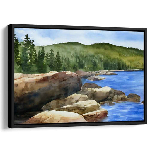 Canopy Sanctuary: Watercolor Landscape with Lush Forest and Rocky Shoreline