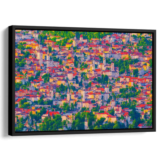 $82.00 USD $118.00Introducing 'Whispers of Colorful Streets,' a mesmerizing canvas art print that offers a bird's eye view of a quaint historic town nestled amidst l...