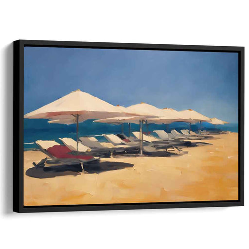 $82.00 USD $118.00Introducing 'Lazy Day Horizon,' a mesmerizing canvas art print that whisks you away to a serene beachside setting, where a picturesque row of sun l...