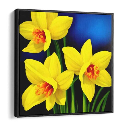 $73.00 USD $105.00Introducing 'Azure Sunflowers Dance,' a mesmerizing canvas art print that showcases a trio of bright yellow daffodils in full bloom against a deep ...
