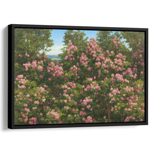 Misty Blossom Haven: Verdant Landscape with Pink Blooms Canvas Art Print