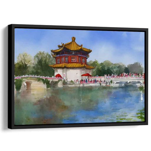 Eastern Tranquility: Traditional East Asian Bridge and Pagodas Watercolor Canvas Art Print