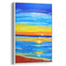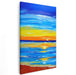 The predominant color palette features a deep, rich blue that symbolizes the expansive sky and the serene waters below. Complementing this primary shade are warm tones of golden yellow, representing the setting sun and its reflection on the water, fiery oranges highlighting the horizon, and subtle touches of red depicting the sandy beach below. The artist skillfully employs a combination of soft, flowing brushstrokes and bold, sweeping lines to convey both the movement and tranquility of the scene.