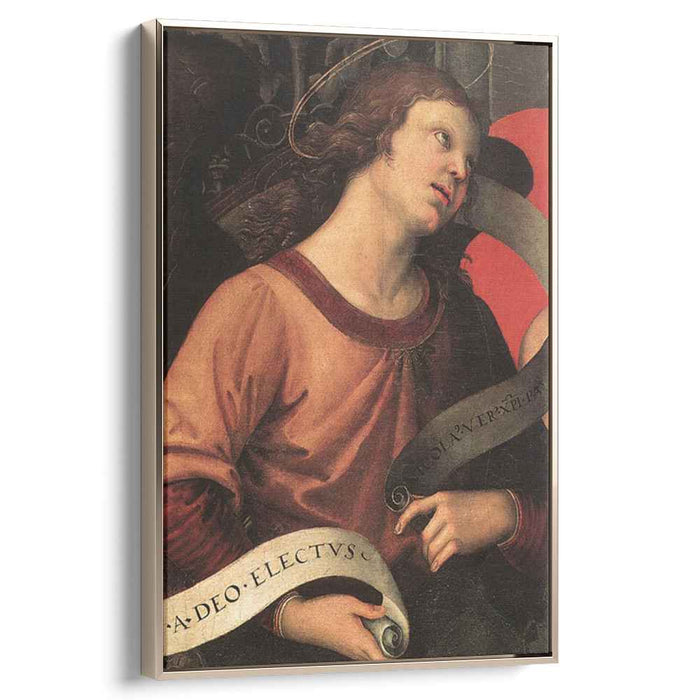 Unveil the ethereal beauty of Raphael's "Angel," a captivating fragment from the renowned "St. Nicolas of Tolentino" polyptych. Painted around 1501 during the artist's early Umbrian period, this heavenly figure now graces a high-quality canvas print, allowing you to experience its divine presence in your own space.