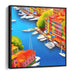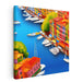 Introducing "Aqua Strokes Symphony," an enchanting impressionist waterfront canvas art print that captures the bustling energy and lively charm of a coastal town. This dynamic artwork immerses viewers in a vibrant seaside scene, where the deep blue waters take center stage, creating a serene yet bustling atmosphere.