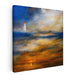 Introducing 'Beacon Above: Lighthouse and Sky,' a mesmerizing canvas art print that transports you to a serene and ethereal landscape where a lone lighthouse stands tall against a dramatic sky, symbolizing hope and guidance in a vast expanse of nature. The artwork is a masterful blend of vibrant and moody colors, with deep blues and fiery oranges dominating the scene, creating a captivating visual contrast.