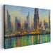 Introducing "Brushstrokes of Twilight Cityscape," a mesmerizing canvas art print that transports viewers into a bustling city skyline at dusk, depicted through an enchanting impressionistic lens. This captivating artwork skillfully captures the play of city lights reflecting on the water, creating a dazzling spectacle of colors and light.