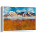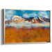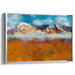 The foreground of this piece bursts with rich, warm tones of oranges and reds, gradually giving way to the cool blues and whites of the majestic mountain peaks and the sky above. Subtle hints of brown, yellow, and green add depth and contrast, enhancing the overall visual impact of the composition.
