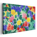 Introducing "Chromatic Explosion Blossoms," a burst of colorful abstract blooms canvas art print that radiates joy and vitality, infusing any space with a lively and vibrant energy. This artwork is a stunning explosion of abstract floral forms, a delightful interplay of bright, bold hues dominated by large, round yellow, red, and pink blooms dancing amongst lush green leaves.