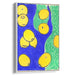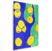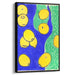 The primary focus of this piece is the vibrant yellow lemons that pop against a rich blue background, interspersed with patches of lush green, evoking the essence of summer and freshness. The color palette is a harmonious blend of bold and cheerful hues, creating a visually stimulating and lively atmosphere.