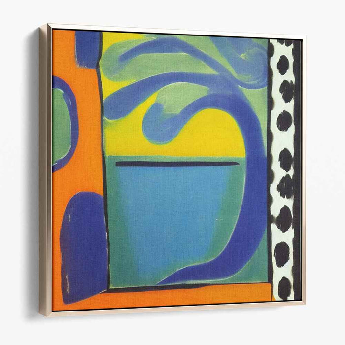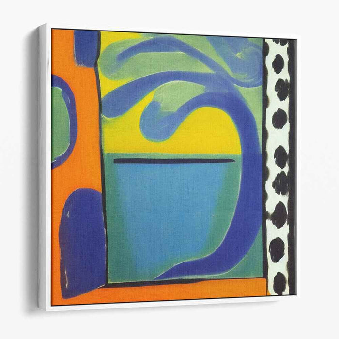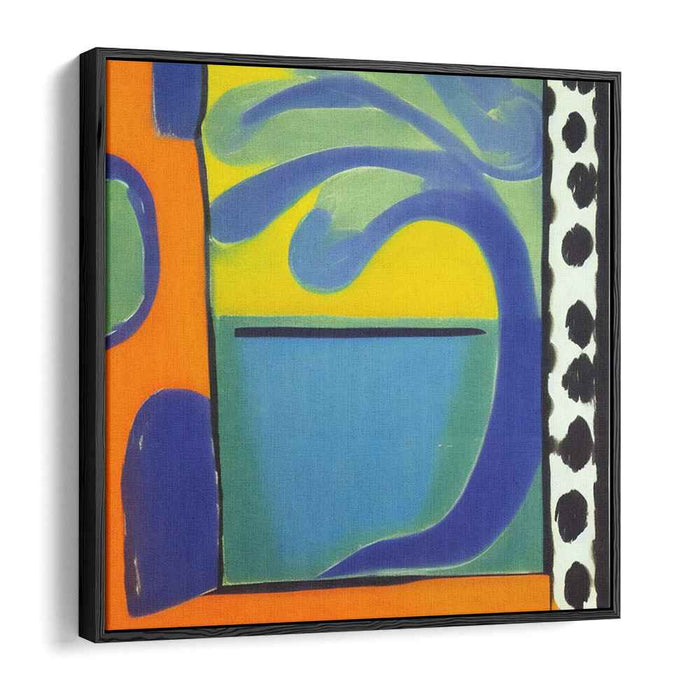The artwork's focal point is a sinuous, curvilinear blue element that elegantly winds its way across a backdrop of green and yellow tones, evoking a sense of graceful movement and fluidity. On one side, a solid orange block provides a stark contrast, while the opposite edge is adorned with a whimsical black and white polka dot pattern, adding a playful touch to the composition.