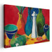 The central focus of the painting is a tall white vase, flanked by a rich green bottle and a deep blue jar, all meticulously arranged to create a harmonious balance. A smaller blue bowl and a yellow-green pear add whimsical accents, contributing to the overall dynamic composition. The artist's use of broad, confident brush strokes imbues the artwork with an impressionistic feel, allowing the colors to blend seamlessly and creating a lively interplay of hues.