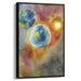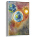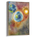 The centerpiece of this artwork is a trio of spherical forms reminiscent of planets, with the central orb bearing a striking resemblance to Earth, adorned with swirling blues and greens that echo continents and oceans. Radiating a warm, fiery luminance, the sun-like sphere adds a dynamic contrast to the composition. Encircling these central figures are smaller orbs and speckles, suggesting distant galaxies and stars, all bathed in a dreamy haze of reds, yellows, and deep blues. The watercolor technique employed here allows for seamless transitions between colors, imparting a weightless and ethereal quality to the piece.