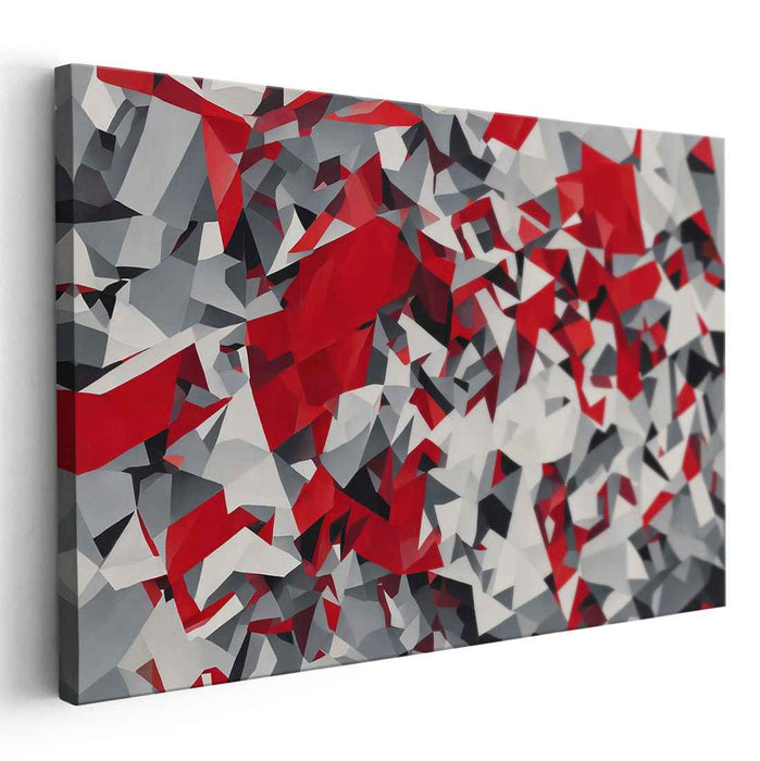Introducing 'Crimson Echoes in Monochrome: Abstract Red and Gray Canvas Art Print,' a mesmerizing masterpiece that mesmerizes with its interplay of geometric shapes and vibrant colors, creating a dynamic and visually stimulating experience. This captivating artwork is a symphony of bold red tones, intricately woven with varying shades of gray and white, forming a complex mosaic of angular forms that dance across the canvas.