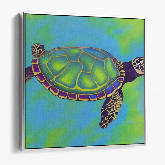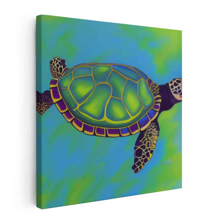 The harmonious blend of blues and greens in the background enhances the turtle's prominence, creating a soothing backdrop that radiates tranquility. This artwork is ideal for spaces such as living rooms, bedrooms, or offices, where it serves as a serene reminder of the natural world's beauty and peace.