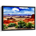 The mid-ground unveils an expansive desert expanse, extending towards a horizon adorned with distant mesas and buttes cloaked in deep purples and browns. Above, a brilliant blue sky embellished with wispy, white clouds infuses the scene with depth and dynamism. The primary hues in this artwork are the earthy reds and browns, harmonized by the greens of the vegetation and the blues of the sky, creating a rich color palette.