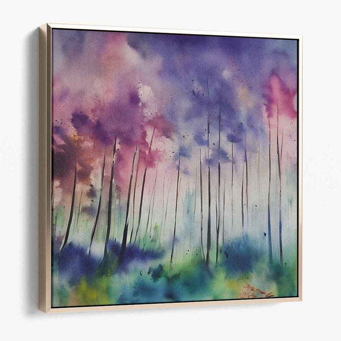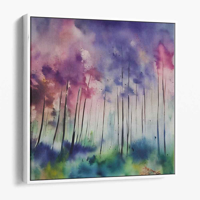 Introducing "Dreamscape Forest," a mesmerizing watercolor canvas art print that transports you into a mystical forest realm suffused with an ethereal glow. This enchanting artwork features towering trees soaring towards the heavens, their slender trunks delicately depicted in bold black strokes against a backdrop of vivid, multicolored hues.
