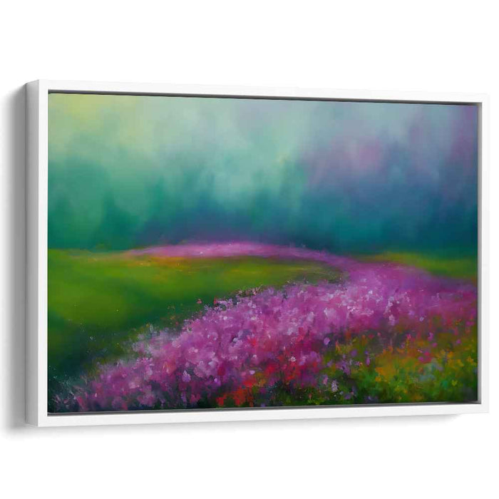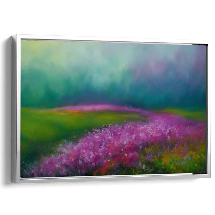 Introducing "Dreamy Meadow," a mesmerizing canvas art print that transports viewers to a tranquil oasis of blooming pink and purple flowers set against a backdrop of lush greenery, all enveloped in a dreamy, ethereal light. This enchanting artwork captures the essence of serenity and wonder, inviting viewers to immerse themselves in its harmonious beauty.