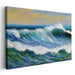 This piece radiates a dual mood of energizing power and tranquil majesty, making it a versatile addition to various spaces such as a living room, office, or beach house. The soft yellow and pale blue hues of the sky above the wave suggest a peaceful sunrise or sunset, enhancing the artwork's serene ambiance.