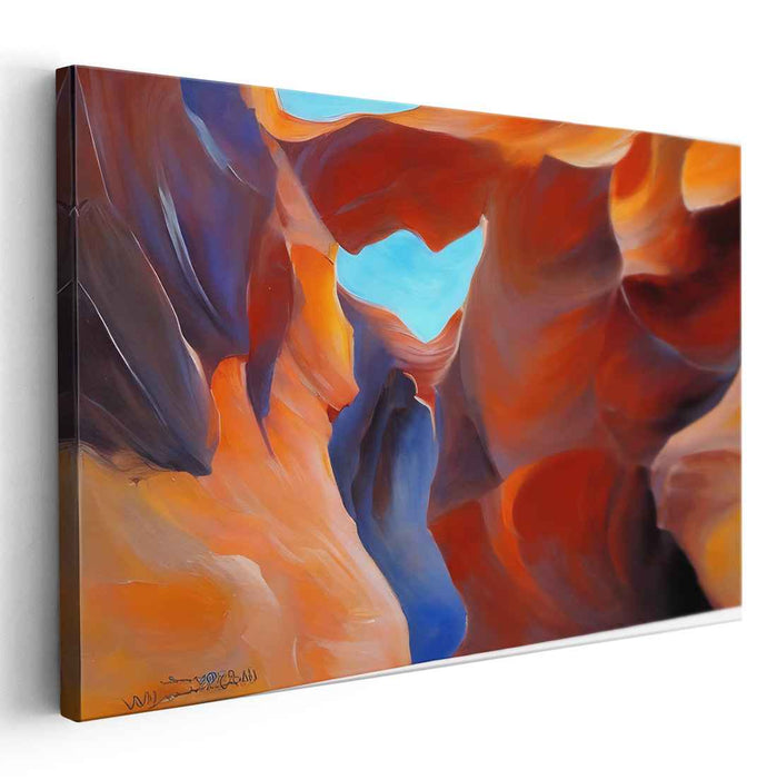Introducing 'Echoes Of Colorful Canyons,' a mesmerizing canvas art print that immerses viewers in the heart of a mystical canyon, capturing the rugged beauty of nature through a dynamic color palette and evocative textures. This stunning artwork features a rich, fiery orange as its primary hue, contrasting with deep blues and subtle browns, creating a tactile experience that beckons the observer to feel the rocky terrain.