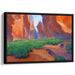 Introducing "Echoes Of Crimson Mesas: Vibrant Canyon Landscape Canvas Art," a mesmerizing piece that immerses viewers in a breathtaking desert landscape, where towering rock formations painted in vibrant hues of orange and red steal the spotlight. The artwork captures a scene illuminated by the warm, golden sunlight, creating a captivating contrast between the fiery rock faces and the lush greenery blanketing the valley below.