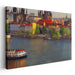 The artist skillfully employs a realistic yet slightly impressionistic style, using soft, blended brushstrokes to create a harmonious and inviting atmosphere. Delicately rendered reflections in the water enhance the overall tranquility and movement within the scene, inviting viewers to immerse themselves in the serene beauty of the riverside cityscape.