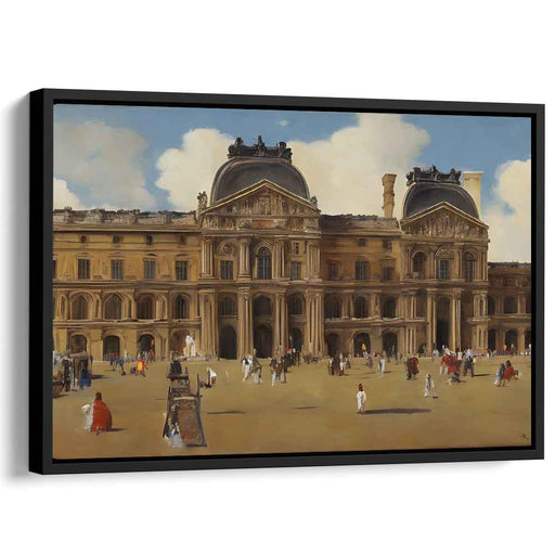 Introducing "Echoes Of Spice Bazaar: A Day at the Grand Market," a mesmerizing canvas art that transports viewers to a vibrant historical scene in front of an iconic building, reminiscent of the grandeur of the Louvre in Paris. This exquisite artwork captures a bustling market or gathering, teeming with people in period attire, set against the backdrop of a majestic architectural marvel.