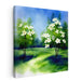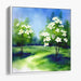 The focal point of this artwork is the abundance of delicate white flowers adorning the trees, their petals radiating a soft, ethereal glow against the lush green backdrop. The artist masterfully blends primary colors, with a dominant blue sky seamlessly transitioning into the vibrant greens of the foliage and forest floor. Subtle hints of yellow at the flower centers and gentle shades of purple in the shadows add depth and dimension to the scene, creating a harmonious and visually captivating composition.