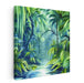 The primary color palette of this piece is a deep, lush green, reminiscent of the dense foliage found in tropical paradises. Hues of blues and teals intermingle, suggesting the presence of water and creating a cool, refreshing ambiance. The play of light through the canopy adds depth and a touch of magic to the scene, inviting viewers to immerse themselves in this enchanting jungle realm.