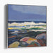 The crashing waves take center stage, depicted in a blend of whites and blues with subtle hints of green, showcasing the sea's relentless motion and vitality. In the foreground, rugged rocks painted in vivid reds, yellows, and deep blues create a striking contrast against the cooler tones of the water and sky. The sky itself transitions from lighter blues near the horizon to deeper, almost purplish tones above, hinting at the intensity of an approaching storm or the calm after one.