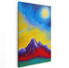Introducing 'Ethereal Glow Peaks,' a mesmerizing canvas art print that transports viewers into a surreal landscape brimming with vibrant colors and dreamlike elements. This captivating artwork features three majestic mountains, their peaks delicately dusted with snow, painted in a bold red hue that transitions into deep purples and blues, exuding a sense of grandeur and depth.
