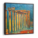 The painting is a symphony of colors and movement, with towering columns depicted in vivid shades of orange, yellow, and gold that stand out against the deep blues and greens of the sky. The artist's bold and sweeping brushstrokes breathe life into the ancient temple, creating a dynamic sense of fluidity and motion.