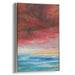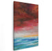 Introducing 'Ethereal Tidal Melodies: A Vivid Seascape Transition,' a captivating canvas art print that skillfully captures the mesmerizing shift from a fiery, turbulent sky to a serene and tranquil sea. This artwork is a striking depiction of a seascape, where the upper portion of the canvas is dominated by a tumultuous sky painted in deep reds, burgundies, and dark oranges, hinting at a dramatic sunset or the aftermath of a storm. The intense and vibrant colors of the sky gradually give way to a calming azure sea at the lower part of the canvas.