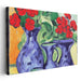 Introducing 'Floral Symphony in Fauvist Blue,' a stunning canvas art print that brings a burst of vibrant energy into any space with its captivating still life composition. This artwork features a pair of elegant vases overflowing with lush red flowers, creating a scene that exudes joy and exuberance.