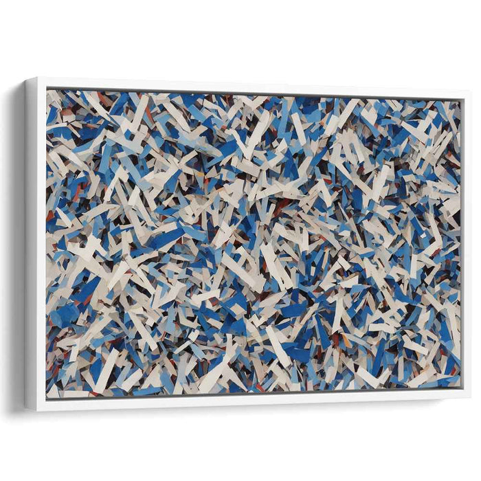 The primary color scheme of 'Fragments of Modernity' revolves around a deep, calming blue, harmoniously accompanied by a palette of whites, grays, and subtle tan undertones. These colors work in unison to establish a sense of depth and intricacy, guiding the viewer's gaze across the canvas to unravel new intricacies and perspectives within the artwork.