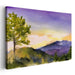 In the foreground, a majestic lone tree stands adorned with leaves in realistic shades of green and yellow, basking in the evening's gentle light. The rolling hills and distant mountains, depicted in varying purples and blues, create a serene depth that exudes peace and contemplation.