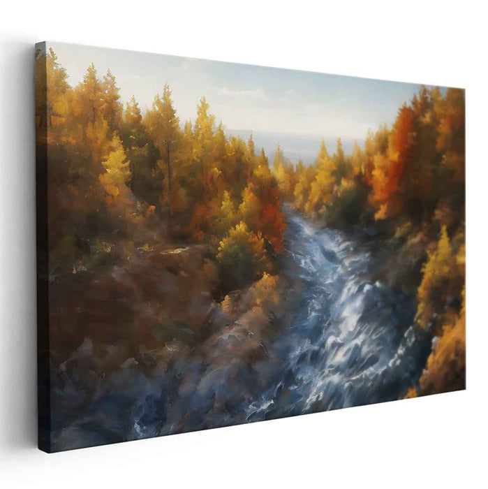 Step into the enchanting world of 'Glowing Waterscapes Mirage: A Luminous River Landscape,' a mesmerizing canvas art print that encapsulates the vibrant essence of autumn's splendor. This artwork portrays a lively river meandering through a forest adorned with a symphony of gold, orange, and amber hues. The trees, basking in the golden glow of the setting sun, radiate a fiery brilliance that harmonizes strikingly with the cool, rushing blues and whites of the river.