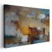 The painting's palette dances between golden yellows, deep oranges, and subtle blues and whites, creating a serene equilibrium that soothes the soul. The blurred, melting forms and blocks of color hint at a cityscape mirrored in water or the fleeting fragments of a dream.