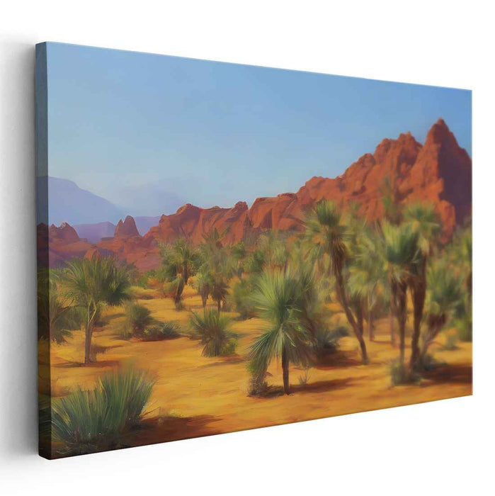 Immerse yourself in the serene beauty of the desert with 'Golden Melodies Whispering Peace: Warm Hues and Tranquil Vistas,' a captivating landscape canvas art that transports you to a sun-drenched desert scene. This artwork skillfully captures towering red rock formations juxtaposed with lush, green palm trees scattered across sandy terrain, creating a harmonious blend of ruggedness and tranquility.