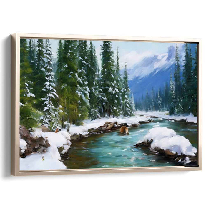 Immerse yourself in the tranquility of nature with "Guardian of the Winter Woods: Snow-Covered Forest with Bear by the River," a captivating landscape canvas art that beckons viewers into the heart of a serene, snow-covered forest. This enchanting artwork portrays a peaceful river winding its way through a dense evergreen forest, encapsulating the raw beauty of untouched wilderness.