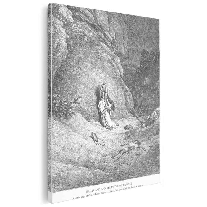 Step into the desolate wilderness alongside Hagar and Ishmael in Gustave Doré's captivating masterpiece, "Hagar and Ishmael in the Wilderness." This hauntingly evocative painting, meticulously recreated on high-quality canvas, captures the poignant tale of abandonment and divine intervention from the biblical narrative.
