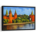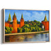 Introducing the mesmerizing "Historic Red Towers: Reflections on a Serene River" canvas art print, a captivating depiction of a historical cityscape reminiscent of Eastern European architecture. This artwork immerses viewers in a scene dominated by vibrant red-brick towers and spires set against a lush backdrop of verdant trees, creating a striking contrast that evokes a sense of grandeur and history.