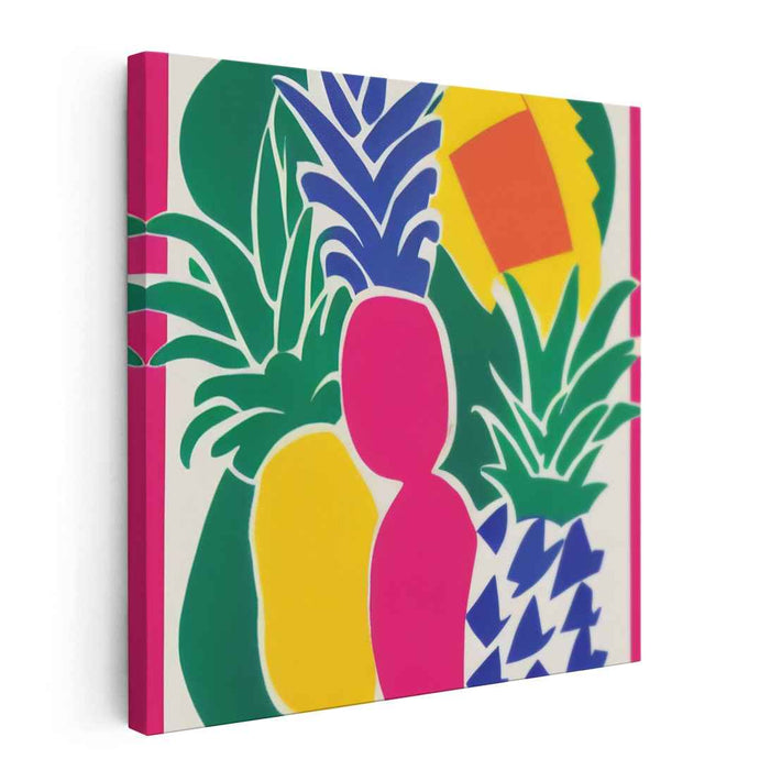 Embracing a modern and minimalist approach, this canvas art captivates with its large, flat color areas and stylized pineapple forms. The geometric leaves and smooth, rounded bodies of the pineapples create a playful and energetic composition that is both visually impactful and easily appreciated from a distance.