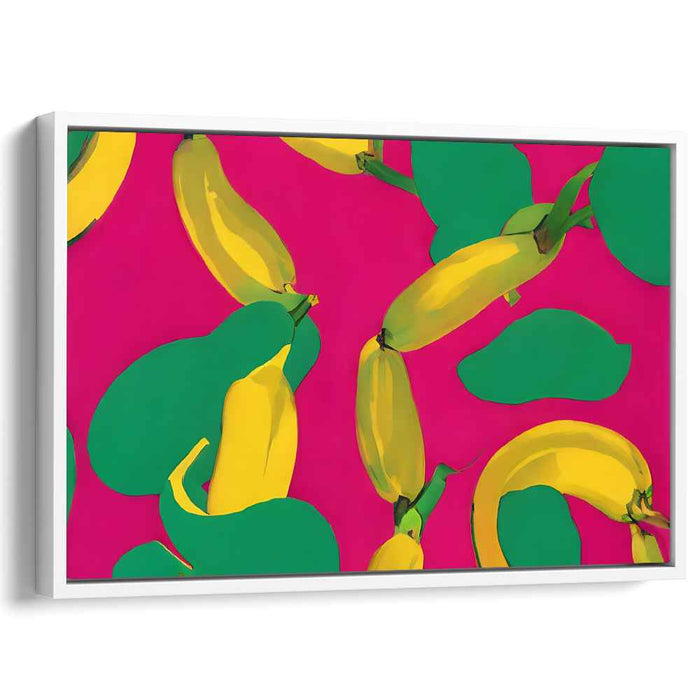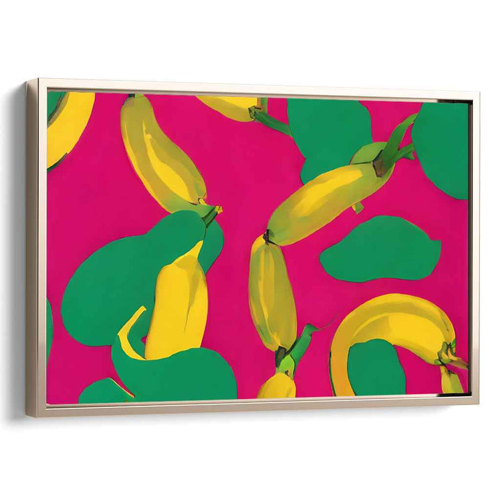 Introducing 'Leafy Yellow Thoughts: Vibrant Banana and Leaf Pop Art,' a mesmerizing canvas art piece that exudes tropical charm and vibrancy, infusing your space with the essence of nature's freshness and vitality. This artwork is a kaleidoscope of colors, featuring luscious yellow bananas set against a bold hot pink background, accentuated by large, dynamic green leaves.