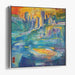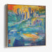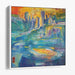 The focal point of the painting is a central vortex ablaze with fiery oranges and yellows, pulling the viewer into a surreal cityscape alive with movement and intensity. The backdrop is a luminous fusion of blues and greens, hinting at both water and sky, while touches of purple and pink add layers of depth and fascination to the composition. The cityscape emerges through vertical and horizontal strokes, hinting at skyscrapers and reflections, inviting the viewer to decipher its urban landscape.