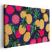 Introducing 'Luscious Tropics: Pineapple and Raspberry Delight,' a vibrant canvas art print that immerses you in the tropical lushness of a paradisal setting, right within your living space. This captivating artwork showcases a delightful array of juicy pineapples and plump raspberries set against a deep navy blue backdrop.