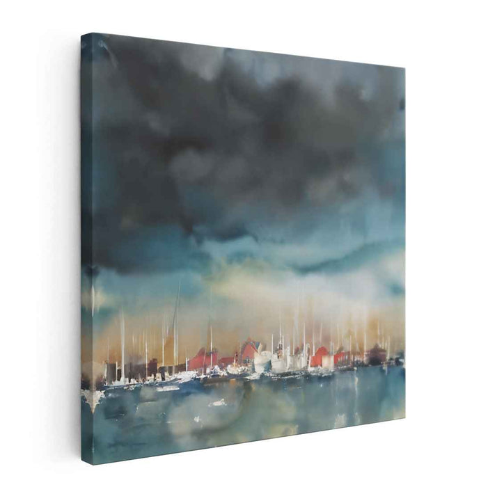 Introducing 'Maritime Whispers: A Stormy Seascape Watercolor,' a mesmerizing artwork that skillfully captures the dynamic contrast between a brewing storm and a tranquil harbor setting. This captivating piece showcases a vibrant marina bustling with sailboats gently swaying on the mirrored waters, against a backdrop of distant buildings painted in warm tones that starkly juxtapose the looming, dark storm clouds above.