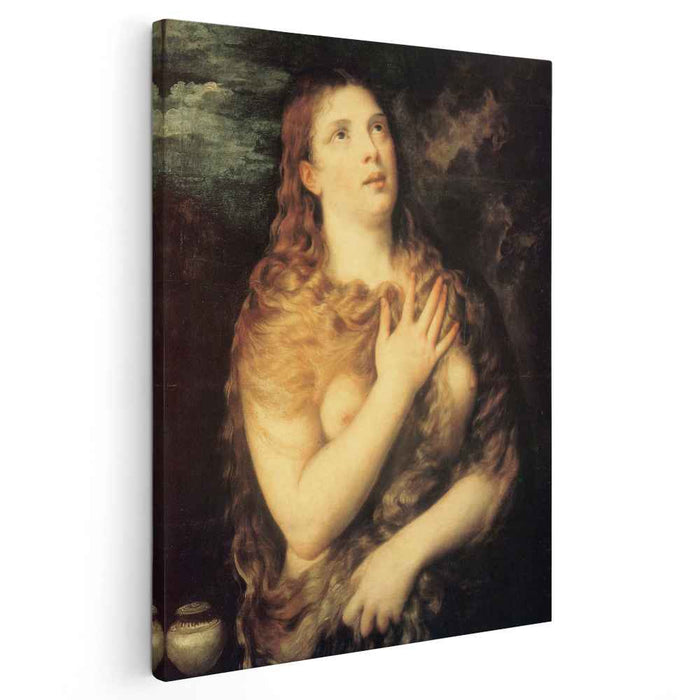 Unveil the captivating beauty of Titian's iconic painting, "Mary Magdalen Repentant" (1531). This masterpiece from the Italian Renaissance is now meticulously recreated on high-quality canvas, inviting you to immerse yourself in its rich colors and profound symbolism.