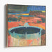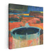 Introducing 'Mystic Well,' an abstract landscape canvas art that mesmerizes viewers with its vibrant color contrasts and dynamic forms, creating a visually immersive experience. This captivating artwork showcases a central circular structure, possibly a well, brimming with deep blue water, serving as a compelling focal point amidst a kaleidoscope of colors.