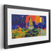 The artist employs bold and sweeping brushstrokes, along with a mix of geometric and organic shapes, to construct a scene that is both ethereal and welcoming. The primary colors are intense and saturated, while secondary hues add layers of depth and complexity to the composition, inviting viewers to immerse themselves in this dreamlike realm.